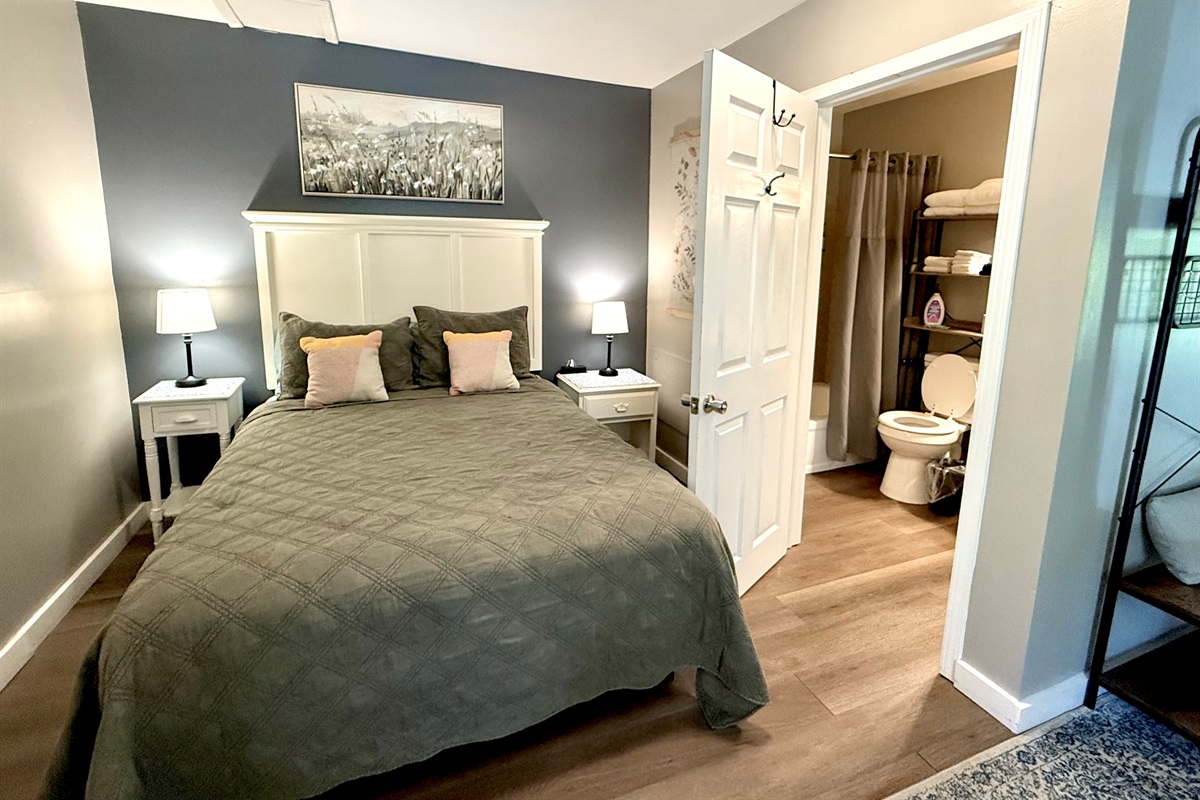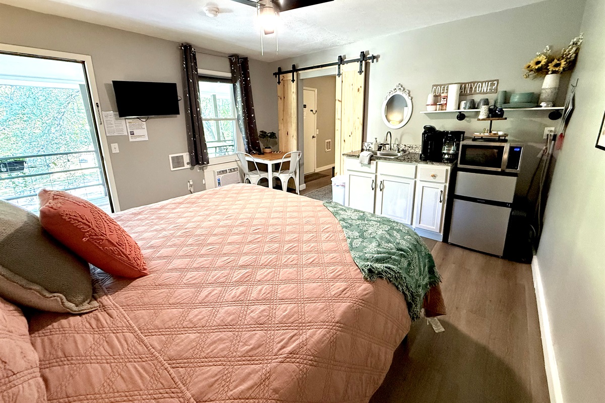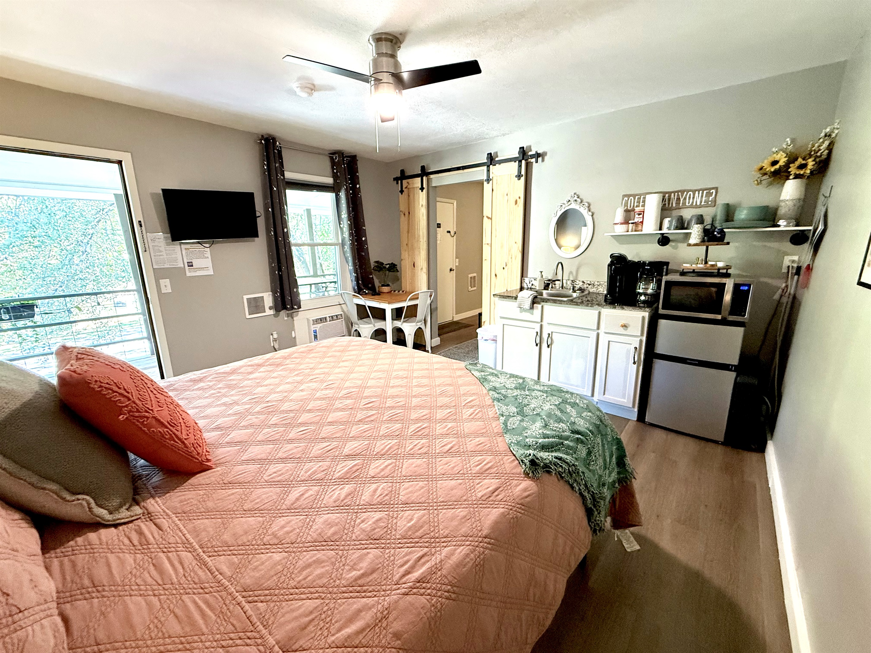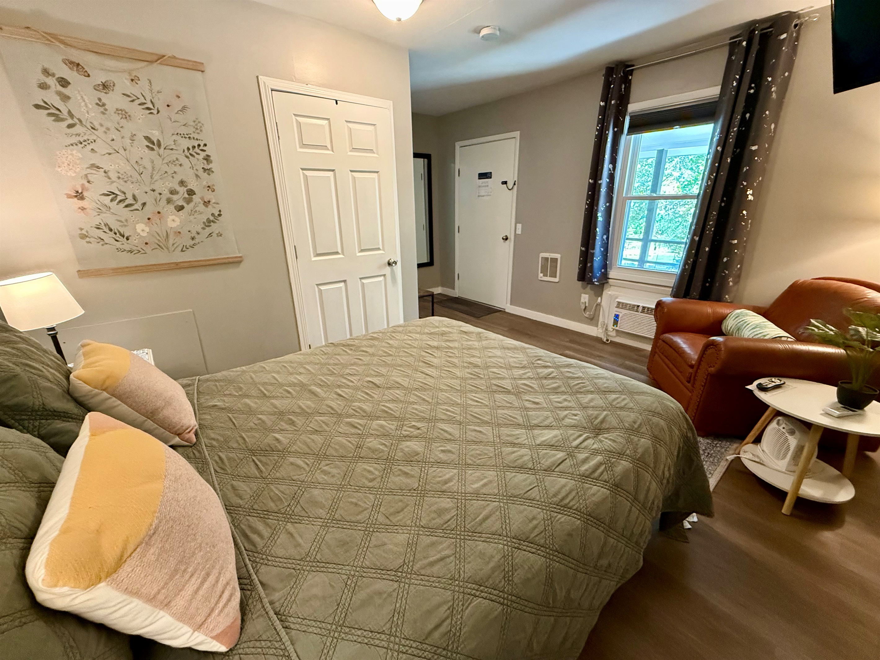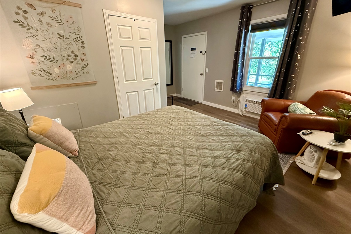 Barn doors to close off second bedroom for privacy. Small seating area in the room.