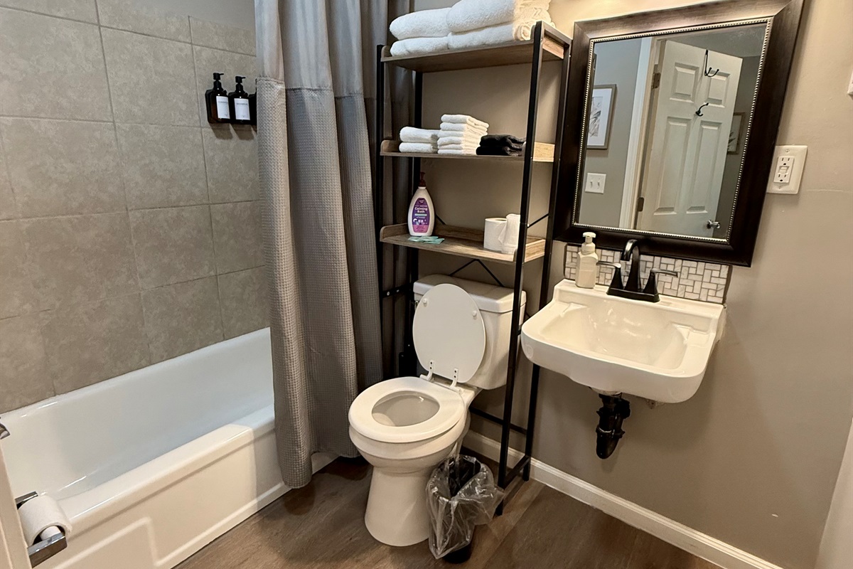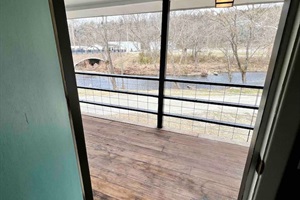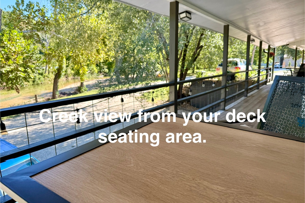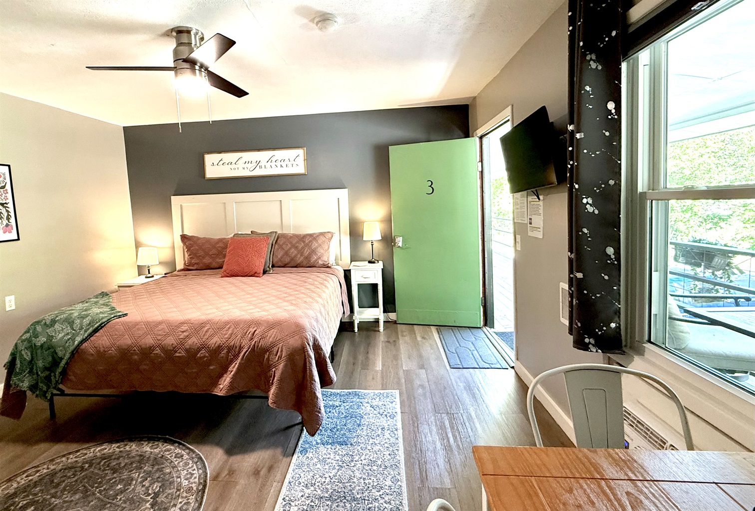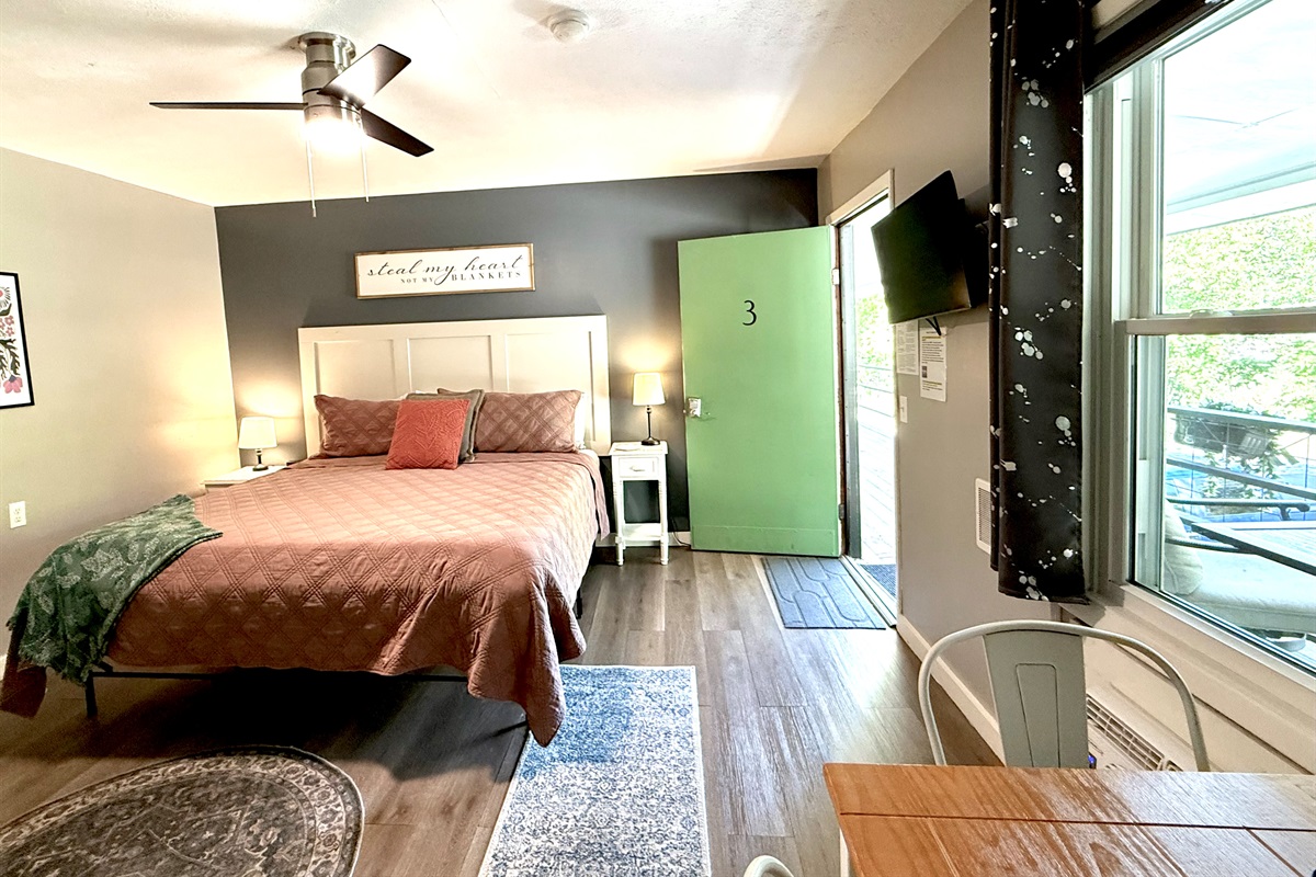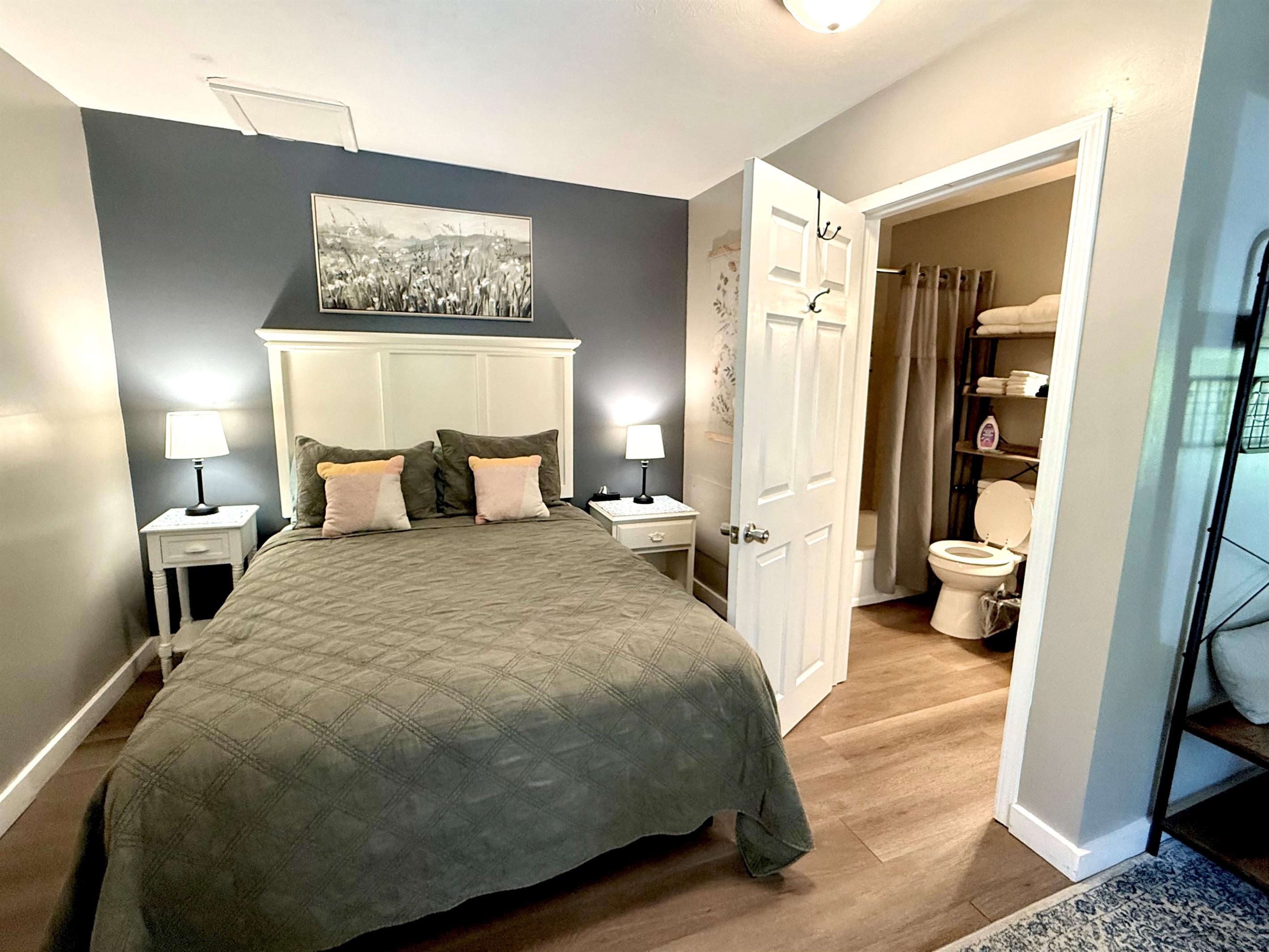 Barn doors to close off second bedroom for privacy. Small seating area in the room.