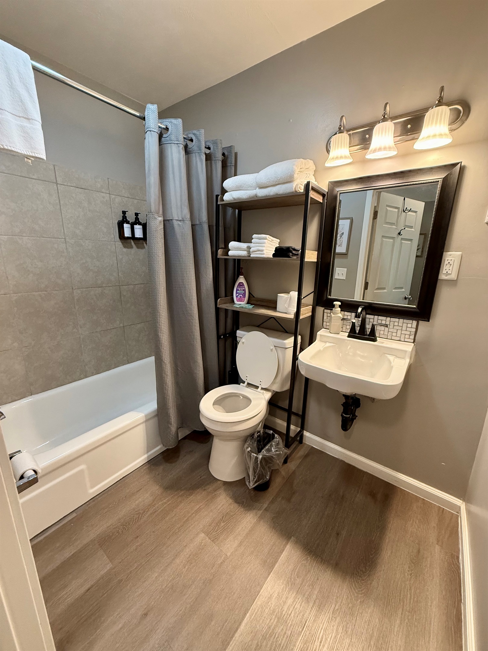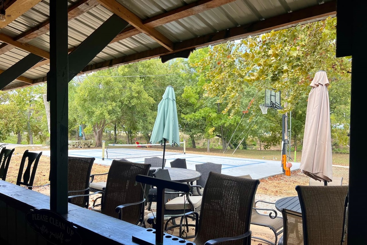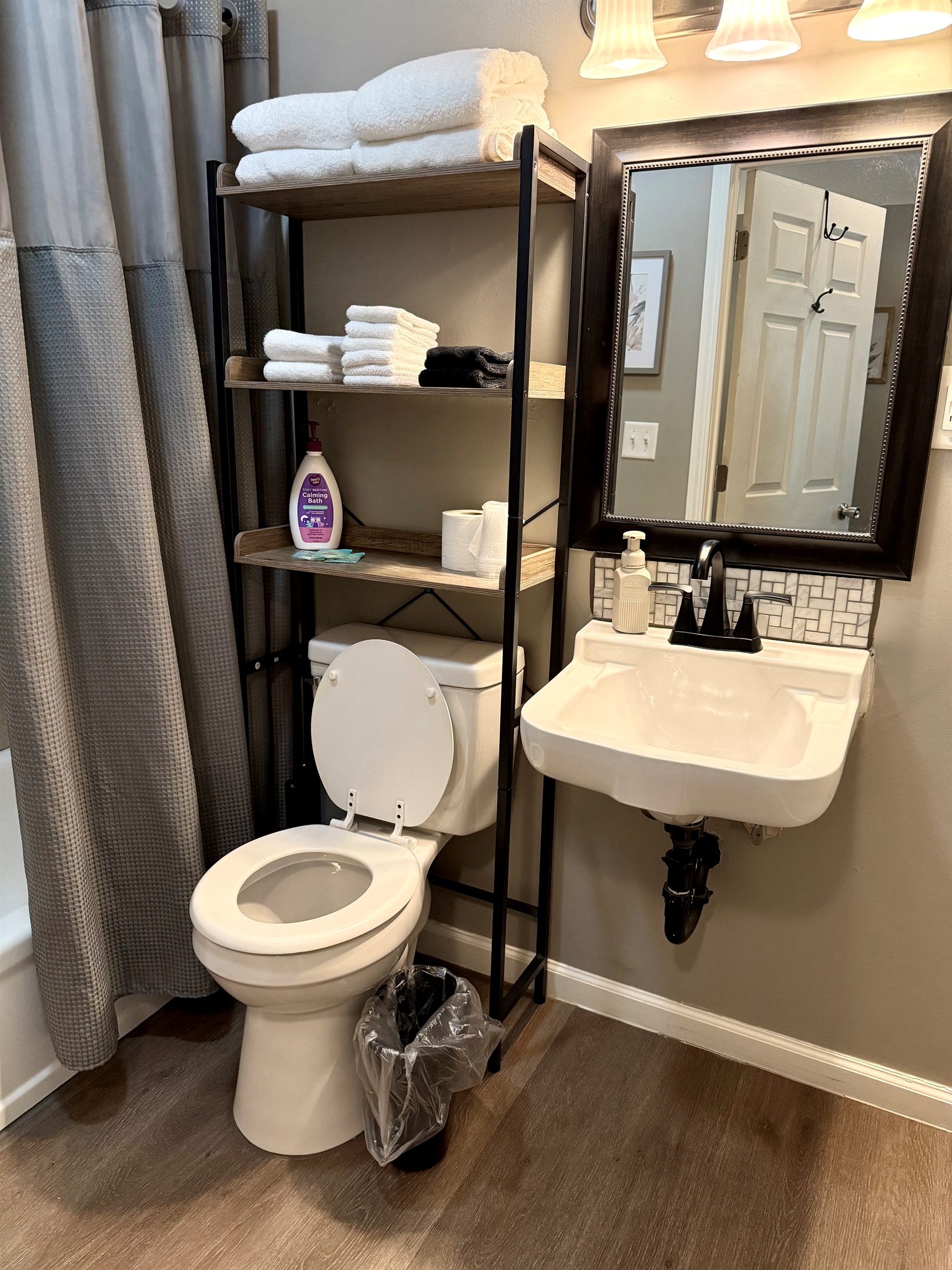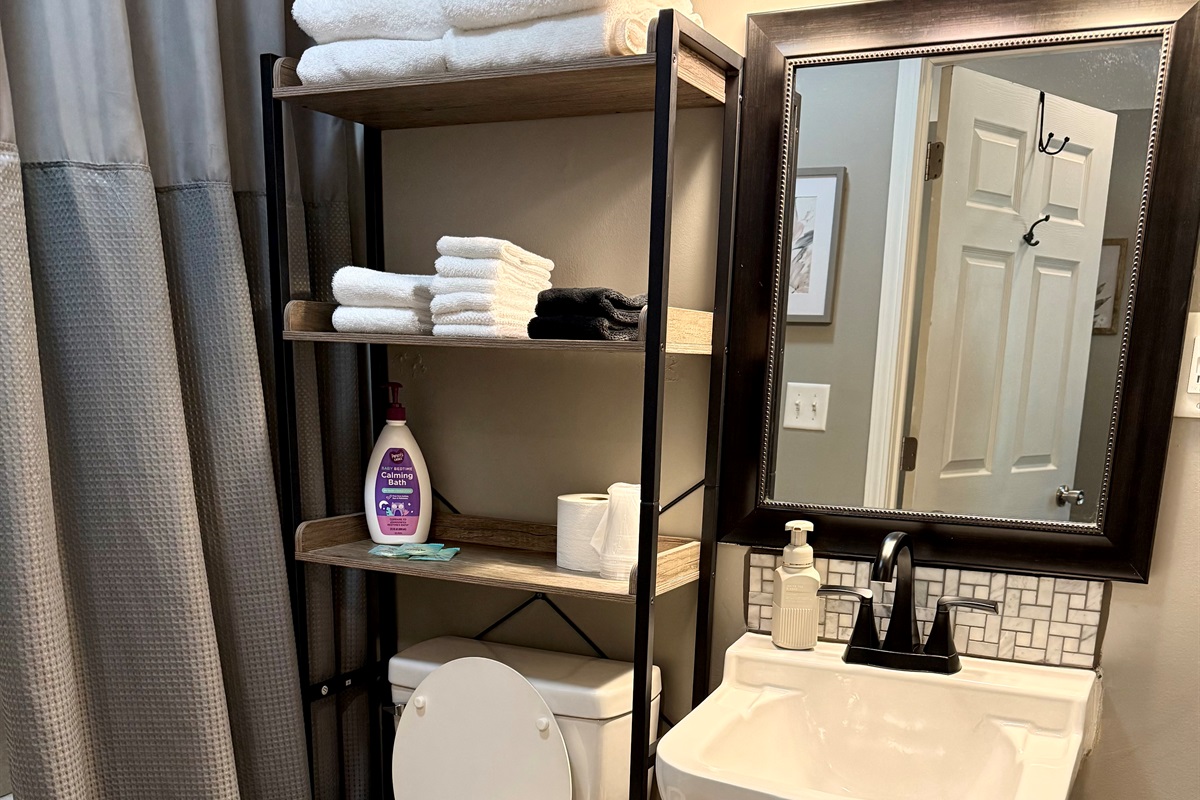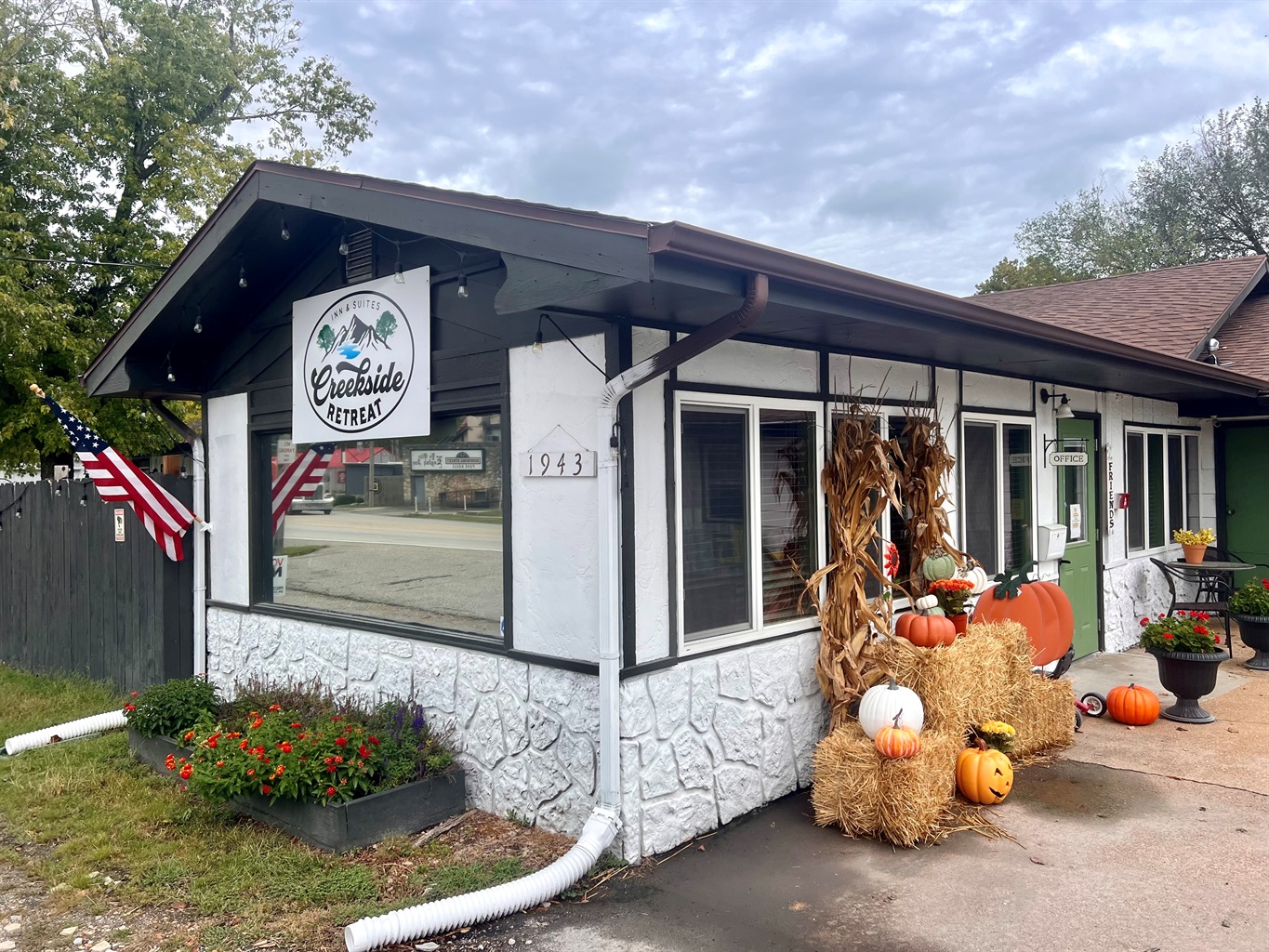 Barn doors to close off second bedroom for privacy. Small seating area in the room.