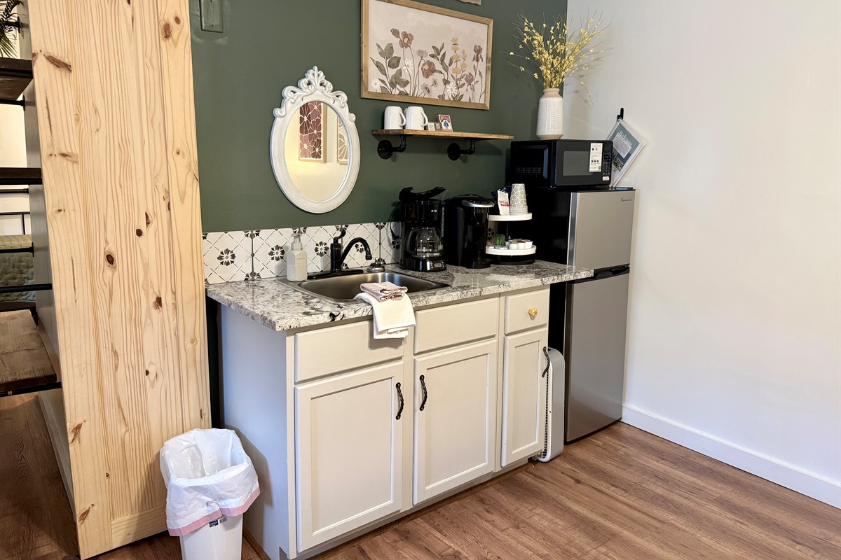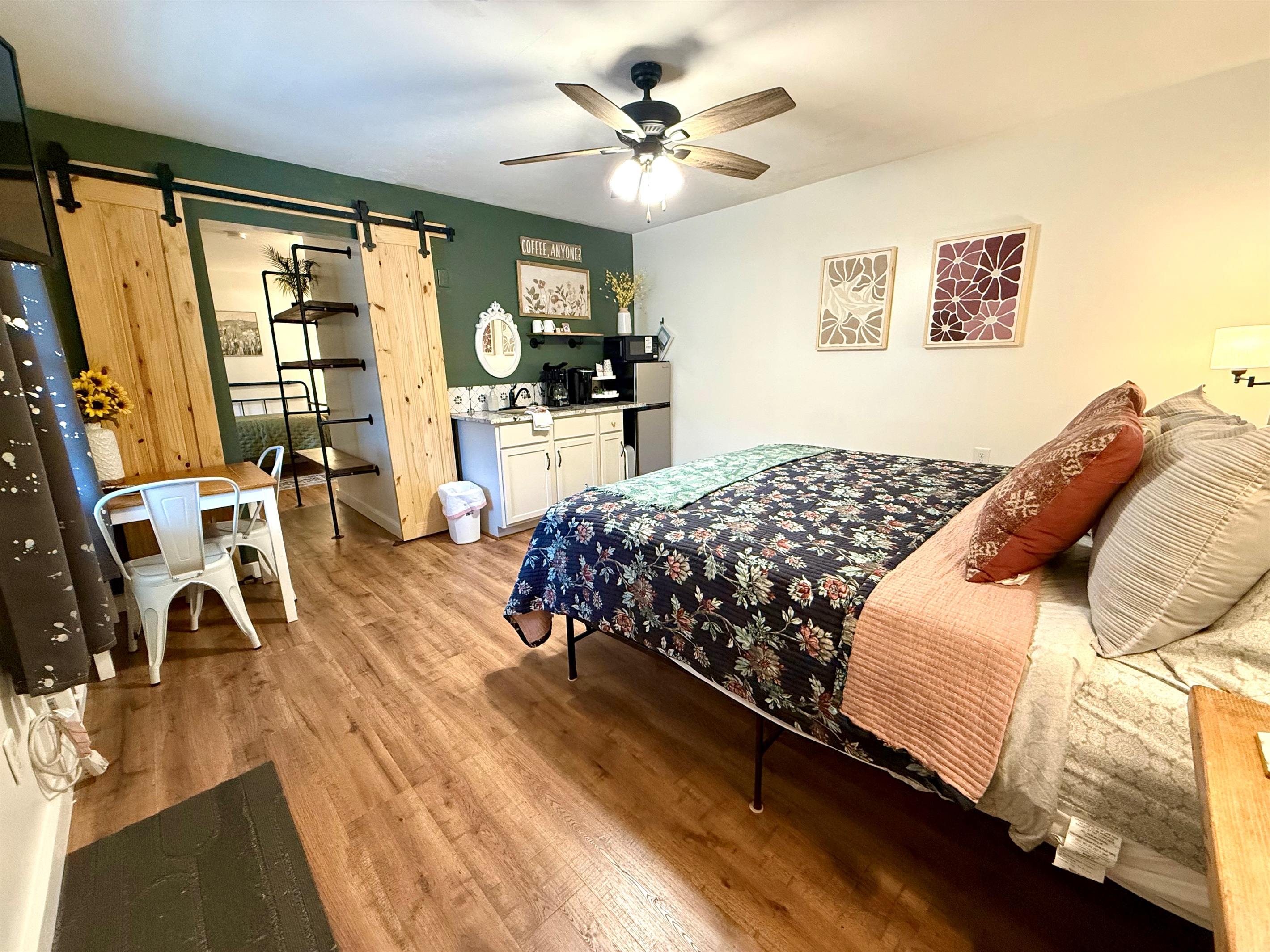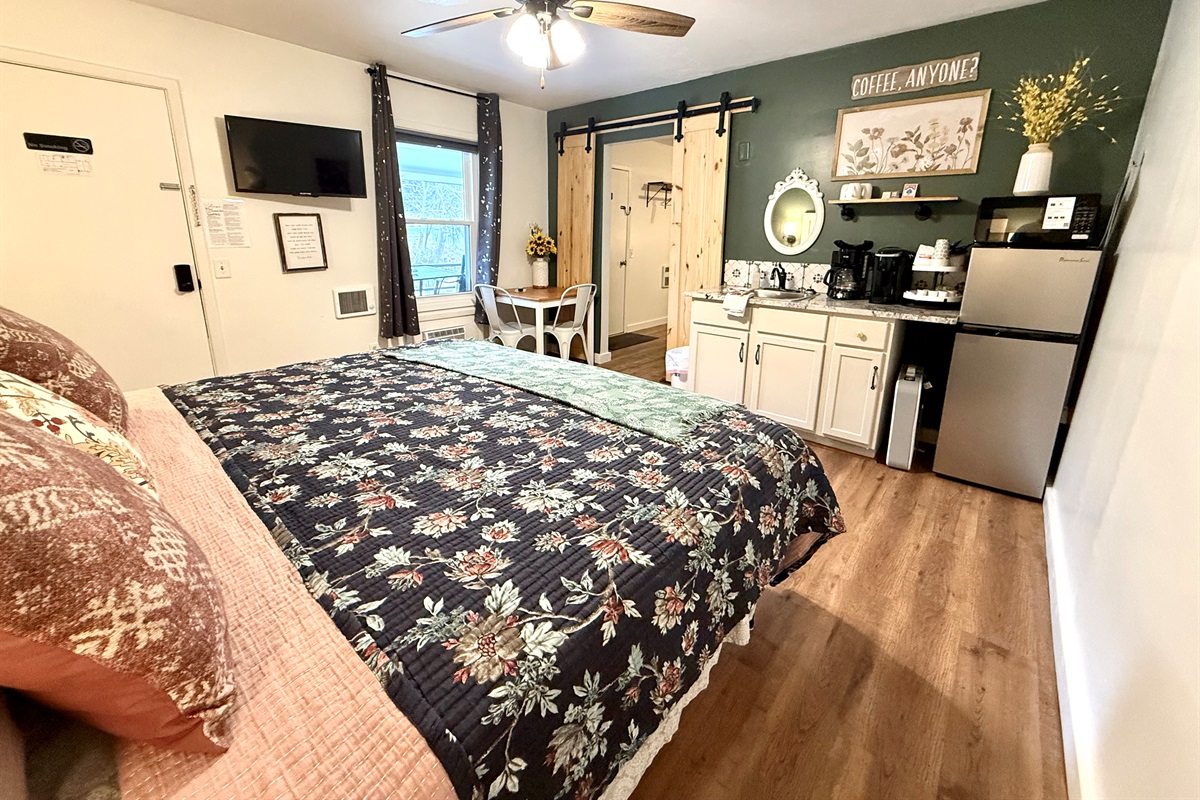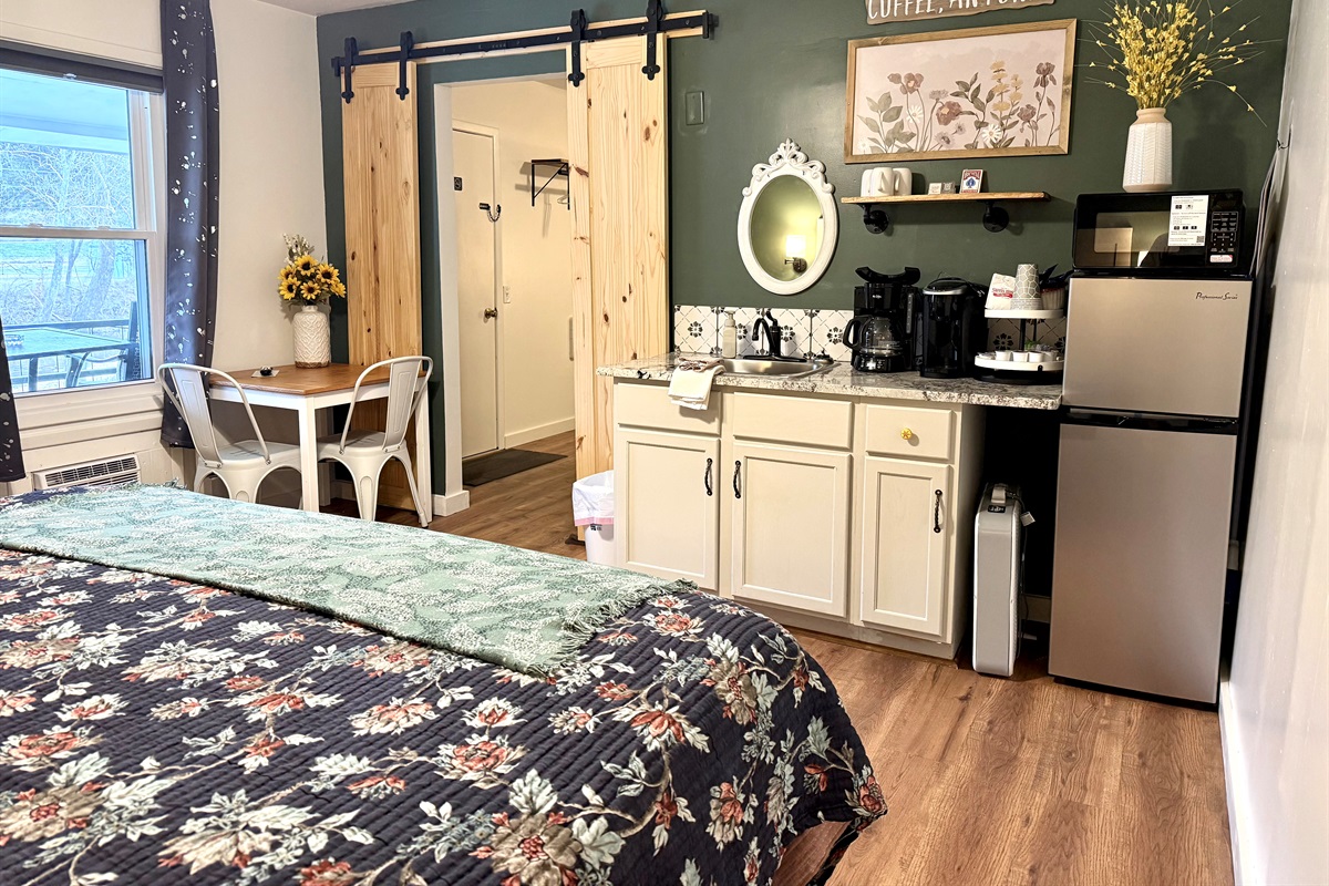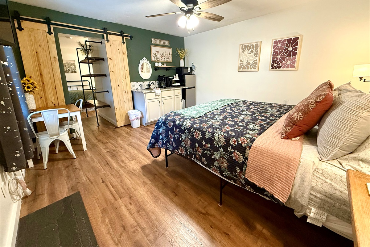 Room 4 is a creek side suite on the back/Creekside of the building. There are two bedrooms divided by a barn door and one full bath. The bath entrance is in the queen bed/twin bed area of the suite. There is a wet bar with a coffee pot, Keurig, microwave, and mini fridge.
