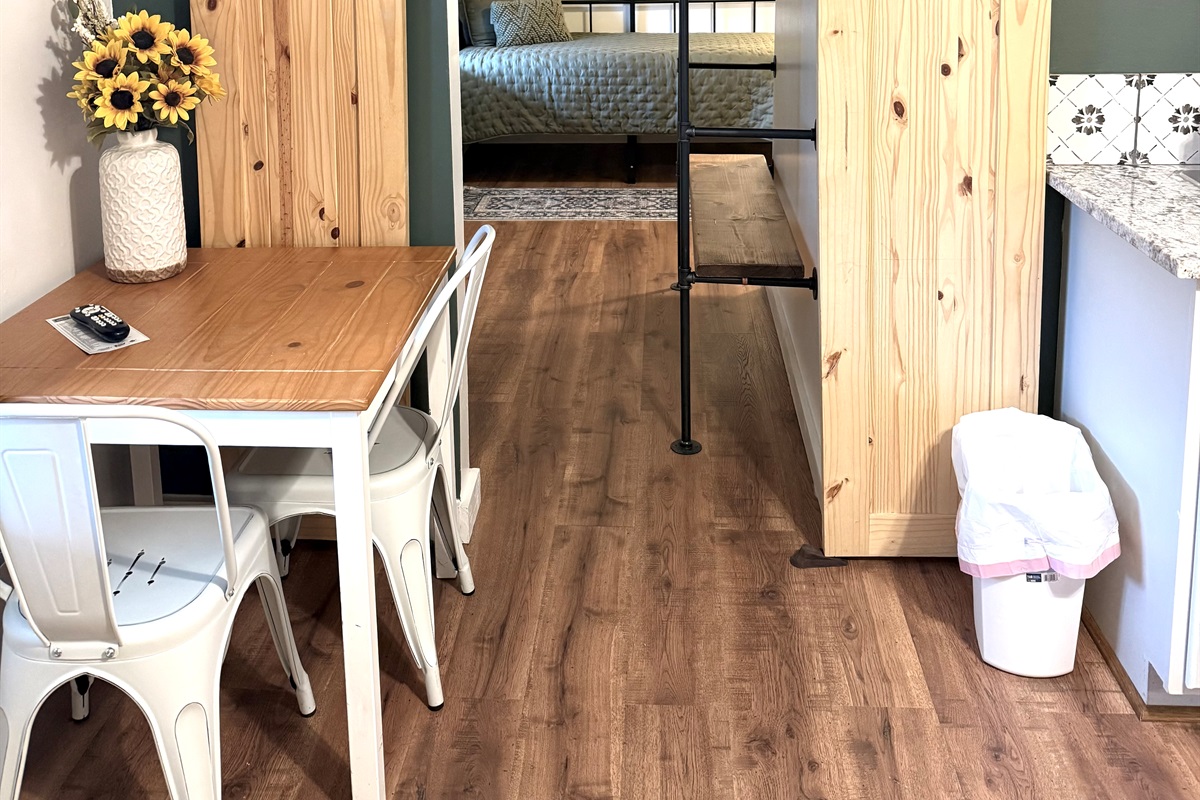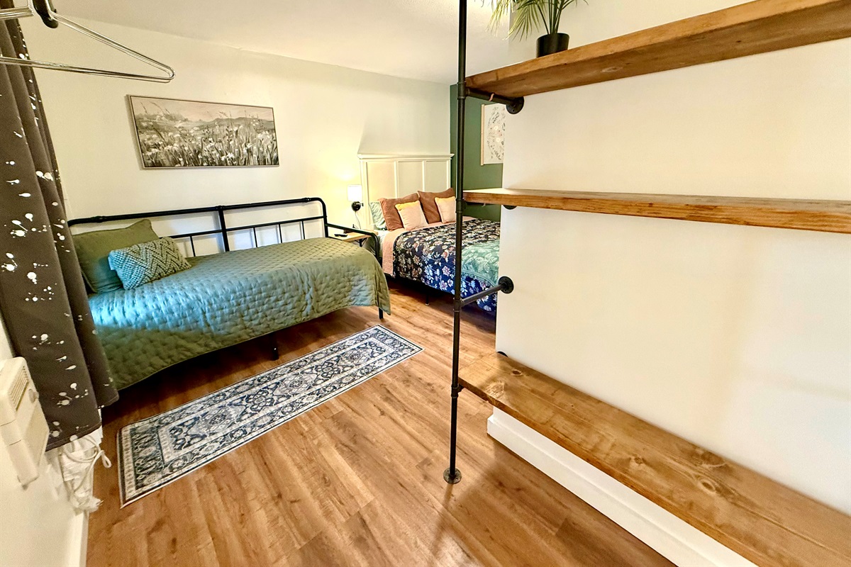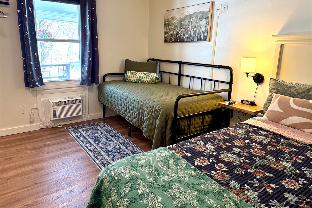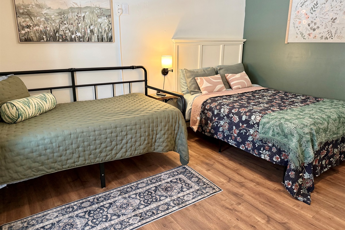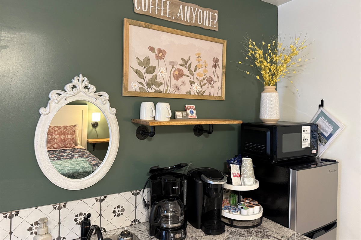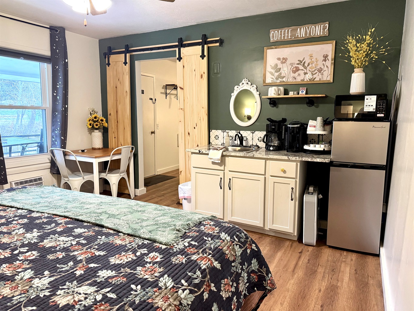 Room 4 is a creek side suite on the back/Creekside of the building. There are two bedrooms divided by a barn door and one full bath. The bath entrance is in the queen bed/twin bed area of the suite. There is a wet bar with a coffee pot, Keurig, microwave, and mini fridge.