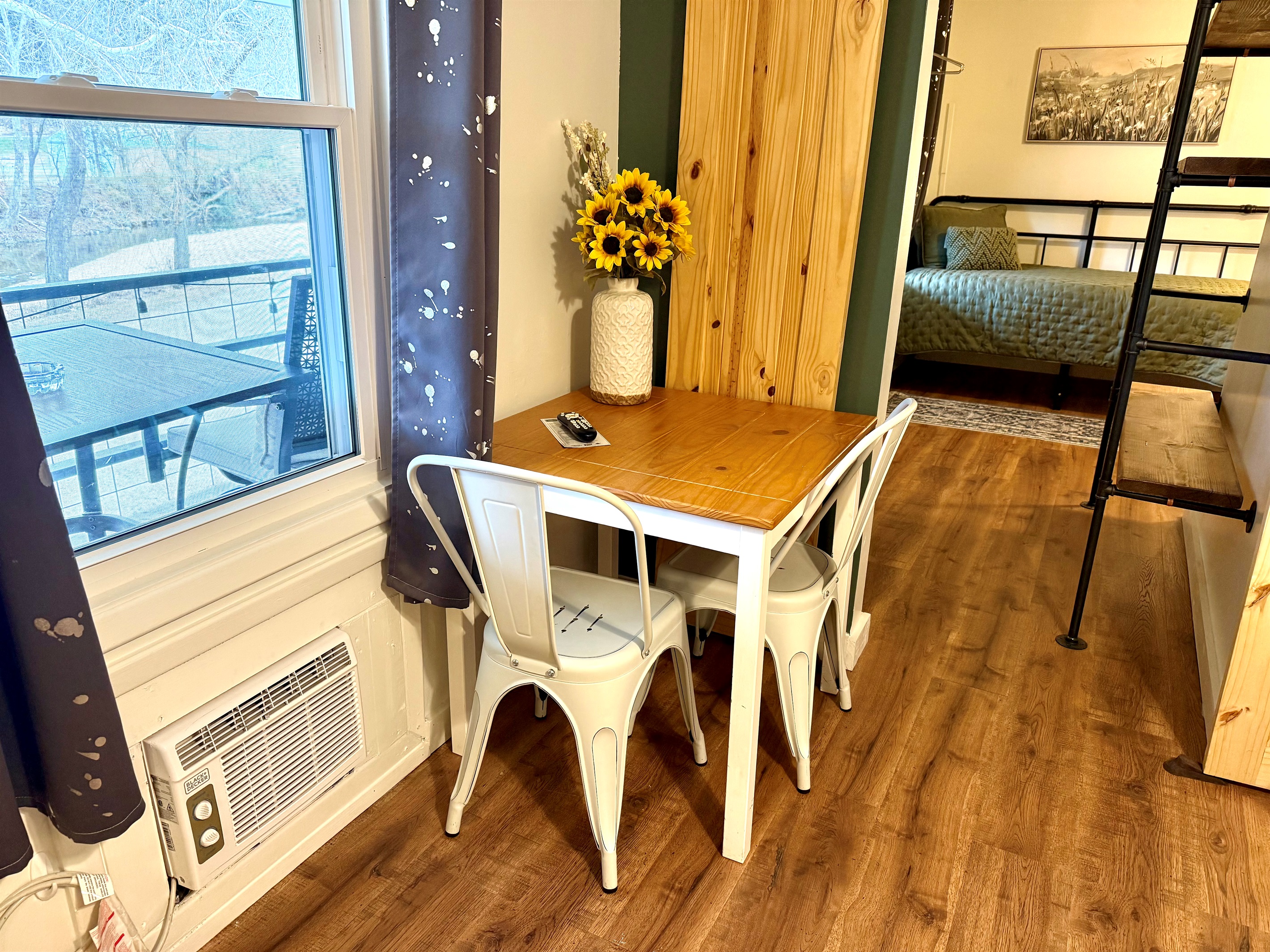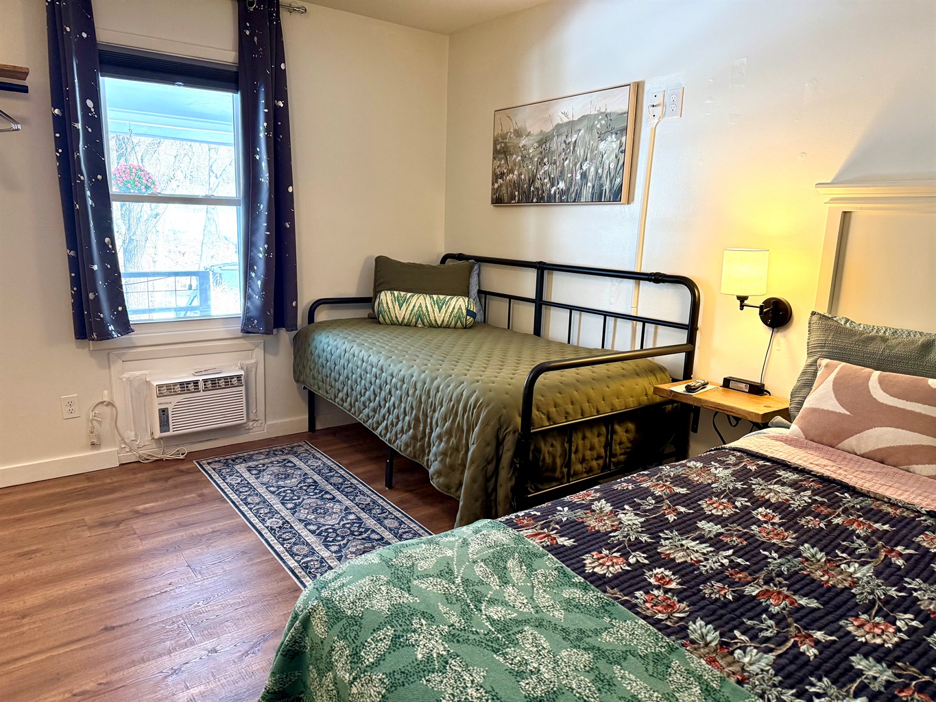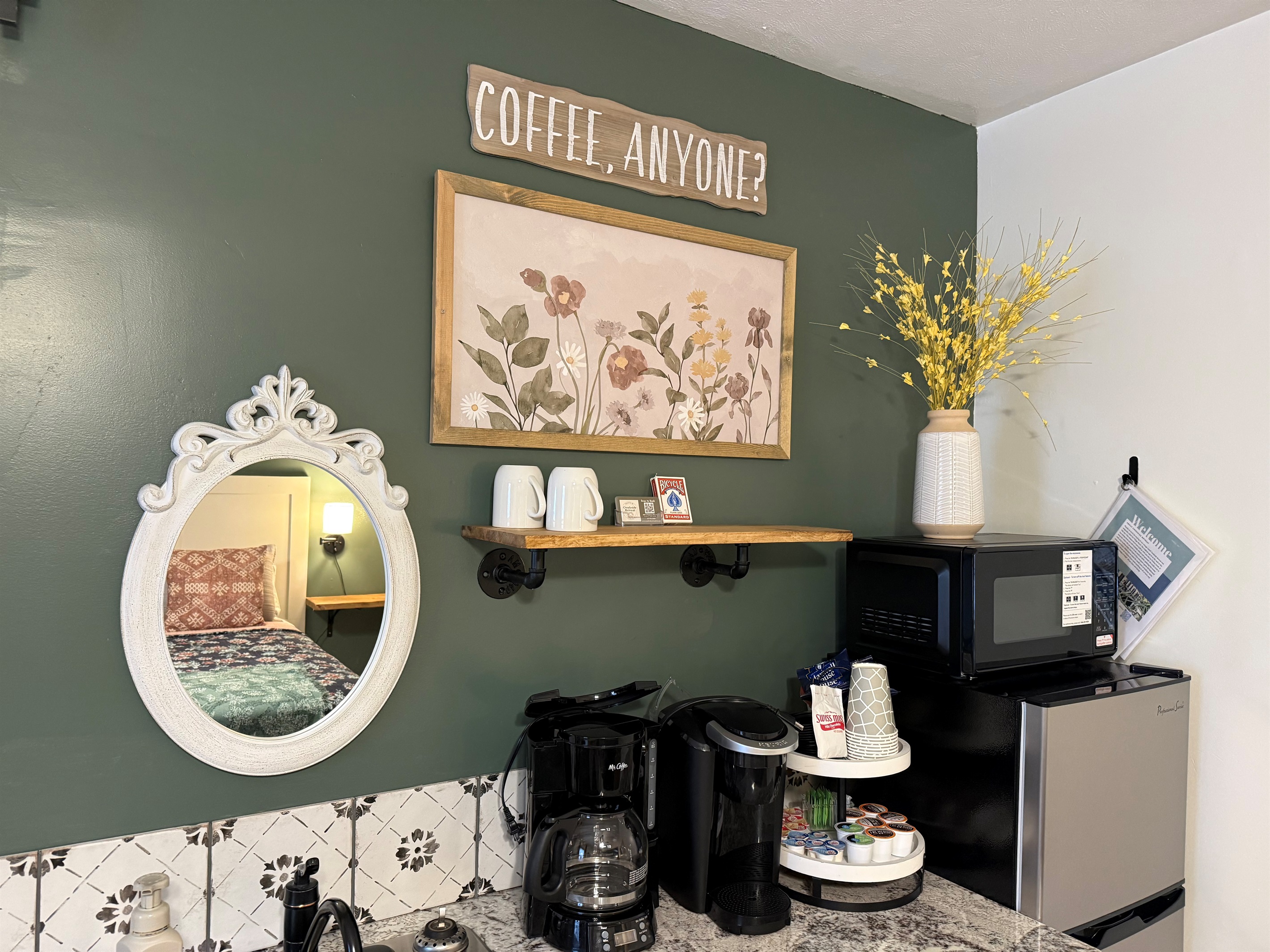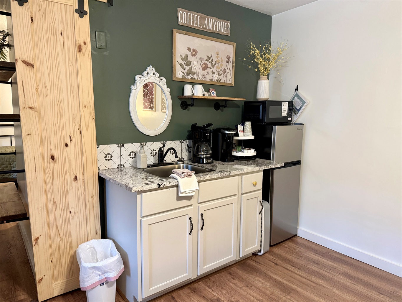 Room 4 is a creek side suite on the back/Creekside of the building. There are two bedrooms divided by a barn door and one full bath. The bath entrance is in the queen bed/twin bed area of the suite. There is a wet bar with a coffee pot, Keurig, microwave, and mini fridge.