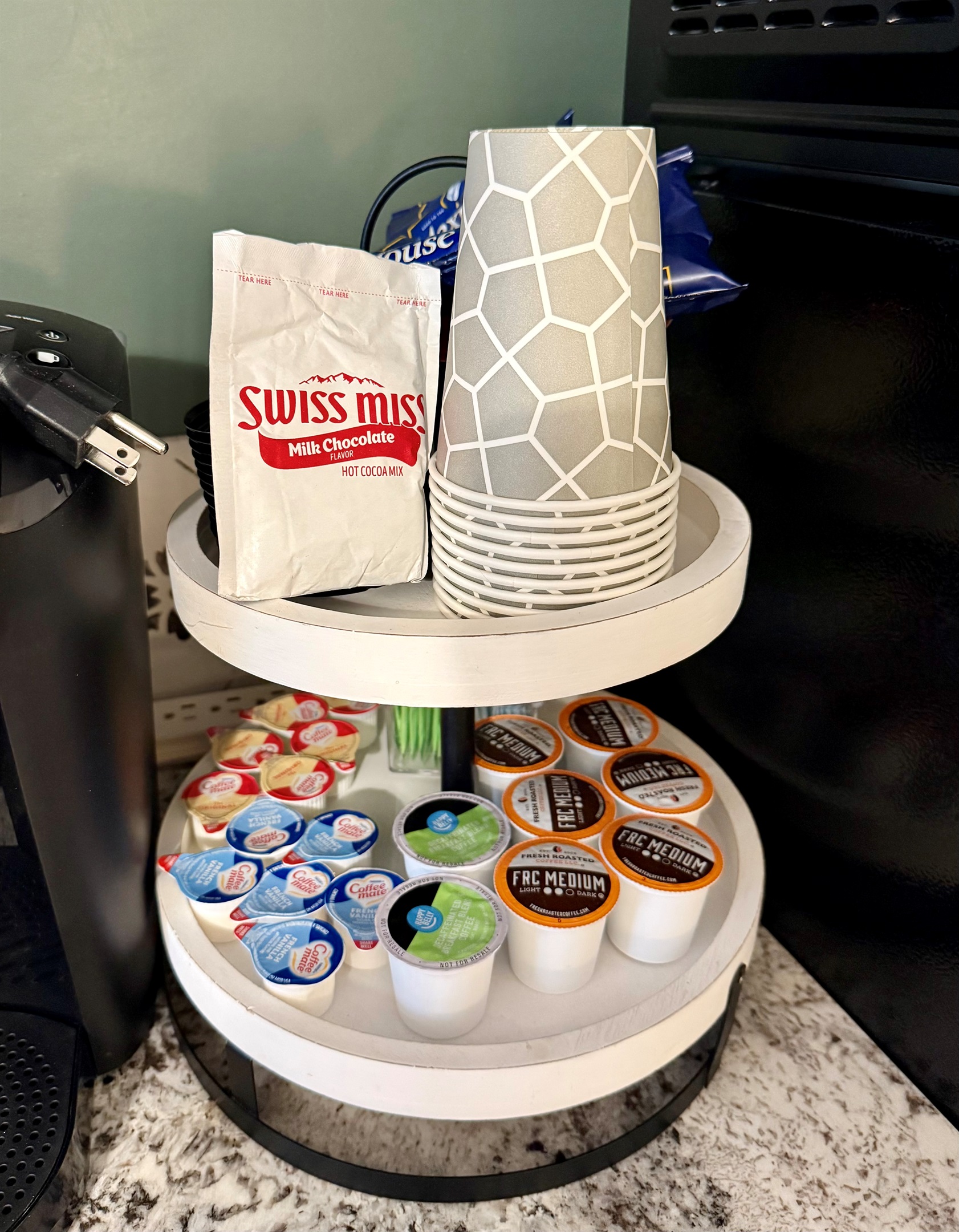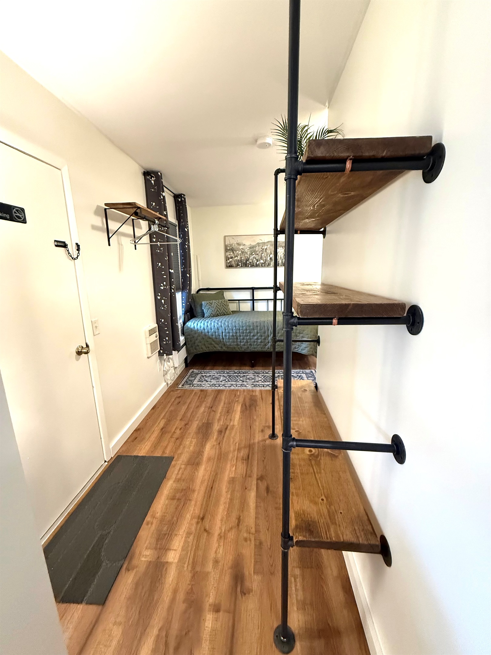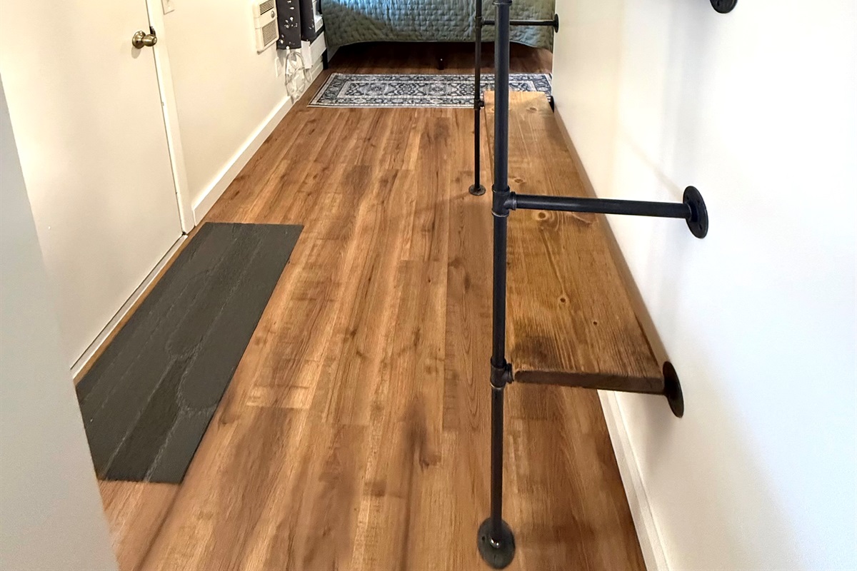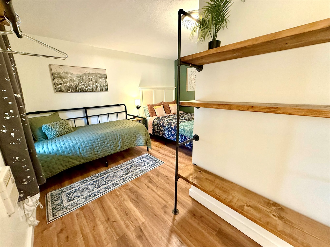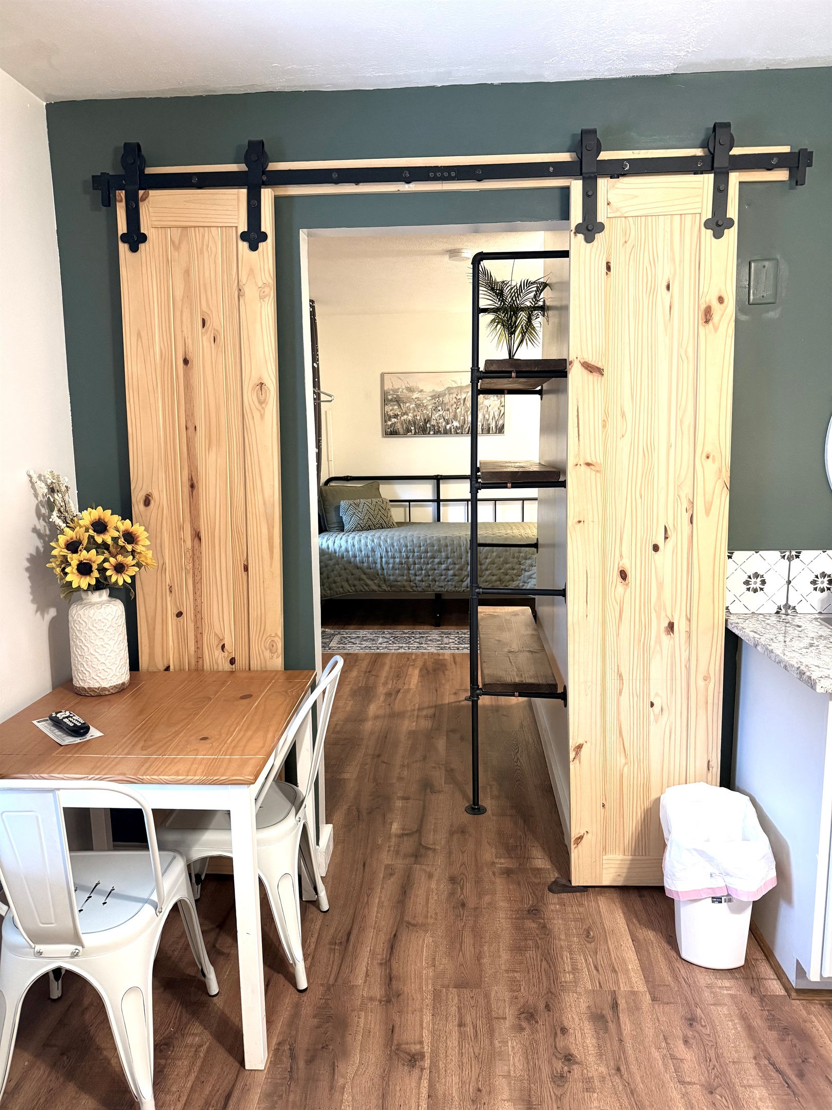 Room 4 is a creek side suite on the back/Creekside of the building. There are two bedrooms divided by a barn door and one full bath. The bath entrance is in the queen bed/twin bed area of the suite. There is a wet bar with a coffee pot, Keurig, microwave, and mini fridge.